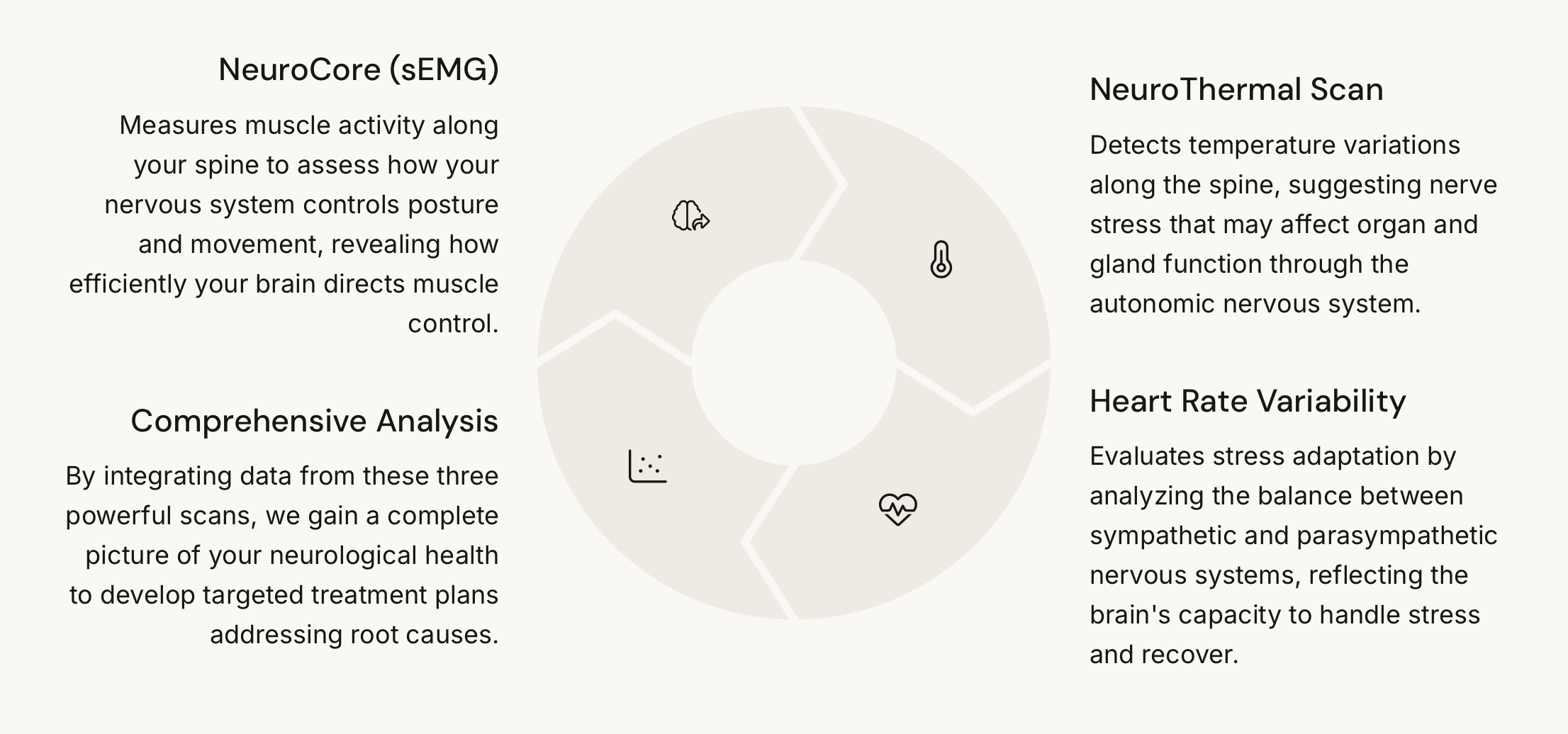 Our thorough evaluation examines the two critical pillars of health: Neurological and Metabolic health. These major systems control and influence every cell, every tissue, and every organ in the body. This enables our team to be able to have a complete picture of your health status, and guide our customized care approach.